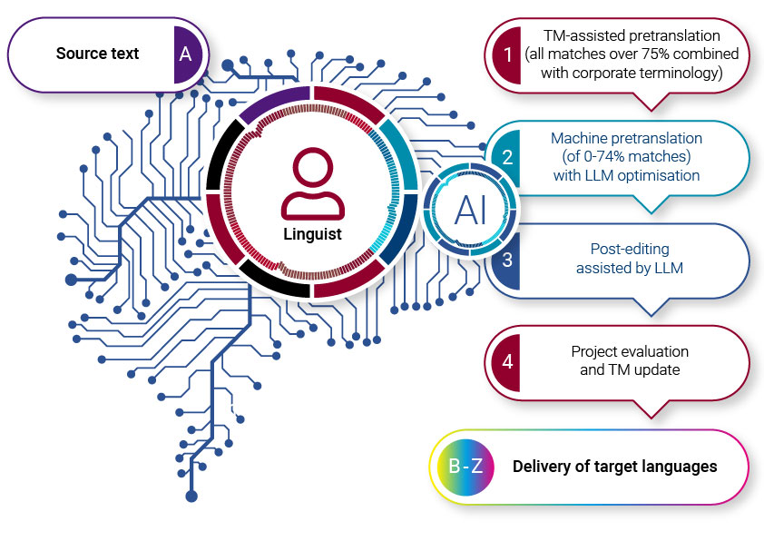 When we talk about machine translation, we are referring to the fully automated translation from the source language into the target language with the assistance of AI based on neural machine translation (NMT). But caution must be exercised here: Machine translation brings with it the potential for errors, so for perfect end results, it must be paired with post-editing by a native-speaking human professional.